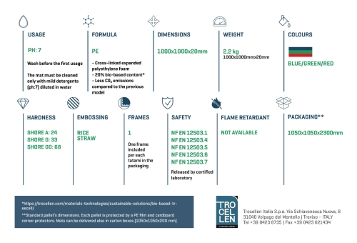 Da die Tatami beständig gegen Wasser und Feuer sind, können Trocellen Karate Tatami drinnen wie auch draussen verwendet werden Mit seiner Puzzleform und geringem Gewicht (2 kg / Stück), ist die Tatami langlebig und einfach zu installieren Da es umkehrbar ist, ermöglicht es die Schaffung von Kampfflächen der verschiedensten Formen und Größen.Zertifikate